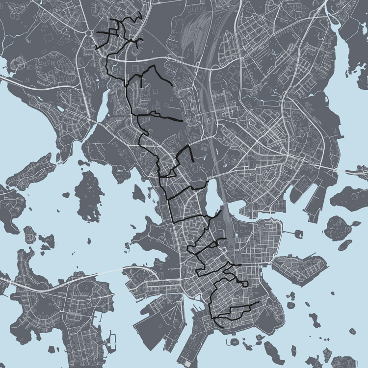 Legendan mukaan Suomi juostiin maailmankartalle. Minä aloitin yritykseni Helsingistä. Sen jälkeen olen yrittänyt juosta muitakin kaupunkeja kartalle. Useimpien kaupunkien kadut eivät mahdollista kauniisti muotoillun reitin juoksemista. Minä olen ollut tyytyväinen lukukelpoiseenkin, mutta kaupunkien ennalta tuntemattomilla kaduilla on yllätyksiä, joiden seurauksena juoksun tuloksena syntynyt teksti hädin tuskin muistuttaa alkuperäistä suunnitelmaa